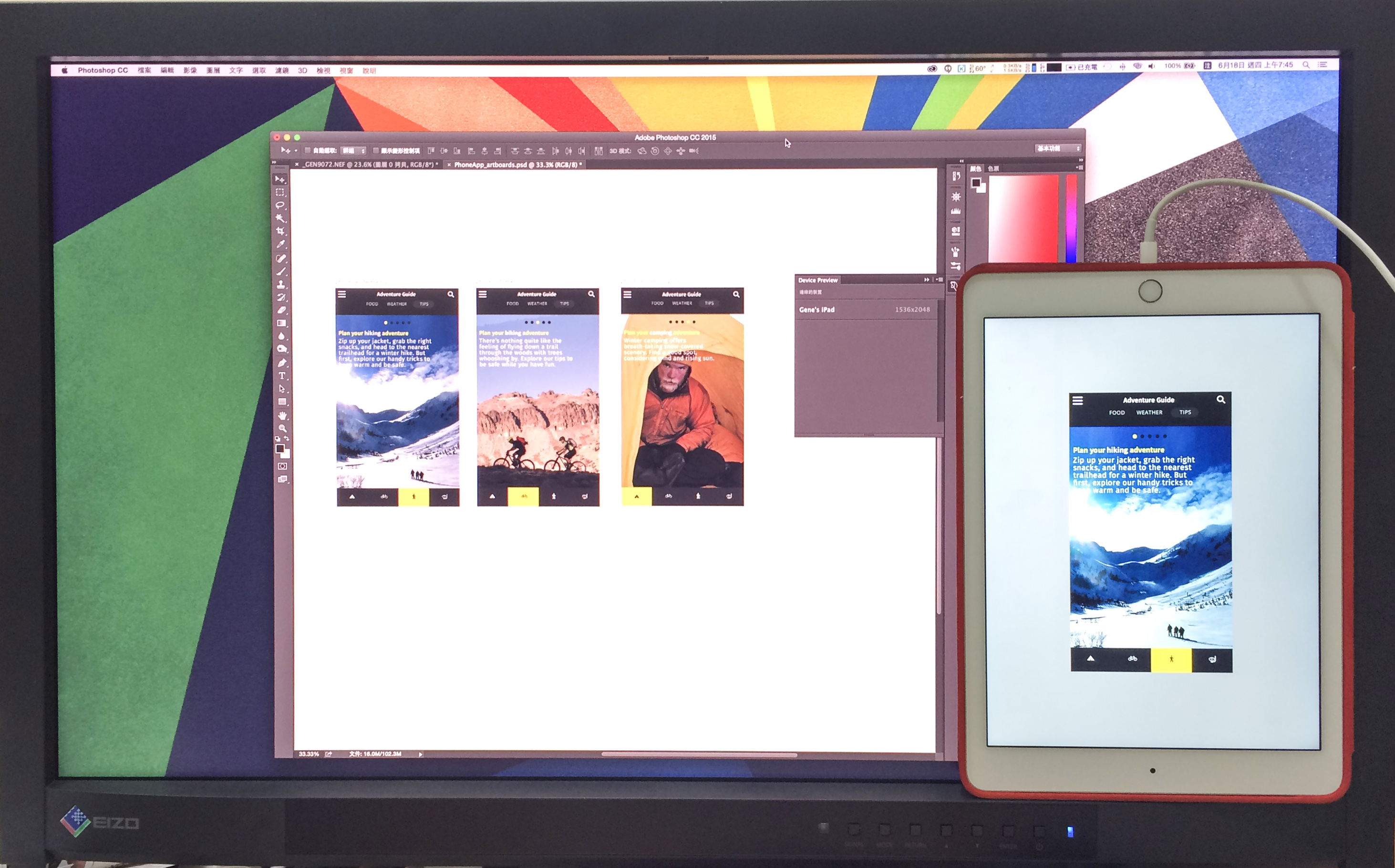 对于设计版面的人来说,有时候你在 Photoshop 上做好后,会想知道效果如何,在新的 Photoshop CC 中,你如果想在工作时一边改,一边观看专案完成后在你的 iPhone 或是 iPad 上呈现的的效果,只要先在你的 iPhone 或是 iPad 上安装 Adobe Preview CC 这个 App 之后,让你的电脑以及行动装置连上同一个 Wi-Fi(或是透过传输线连结),便可即时观赏改变的效果,如上图便是将以 iPhone 为版型开版的设计放置在 iPad Air 2 上的效果,对于需要在外提案,需要即时更动以便客户观看的设计师来说,绝对是个方便好用的功能。