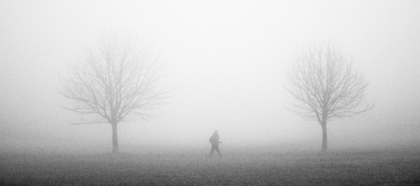 上图是张摄影师拍摄雾中人走路的样子,如果你今天想要让雾感看来没那么重,你可以在 Camrea Raw 中增加 Dehaze 功能的值,让照片看起来没那么朦胧,但同样的从照片中可以看出颗粒感较上图明显许多。